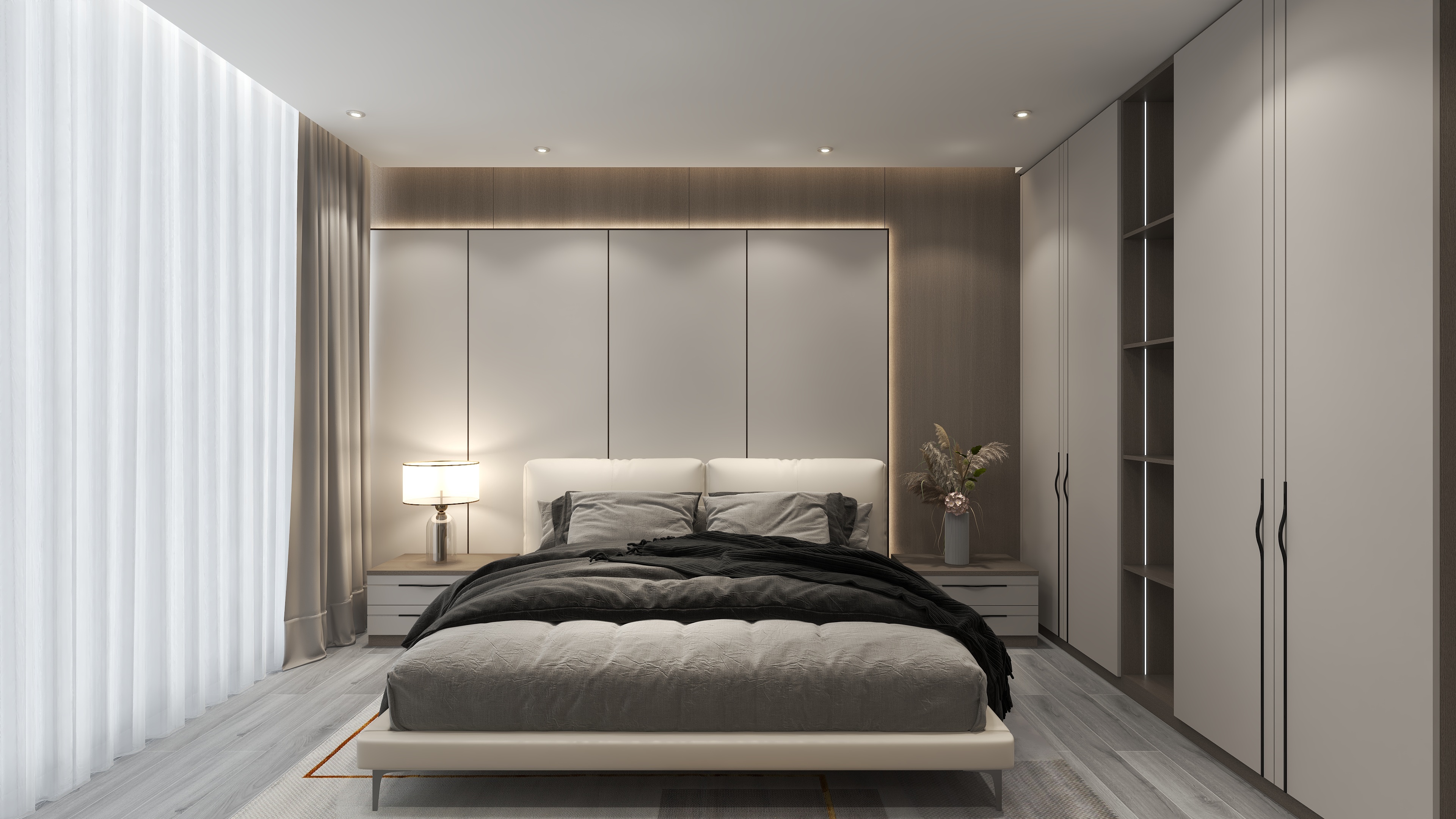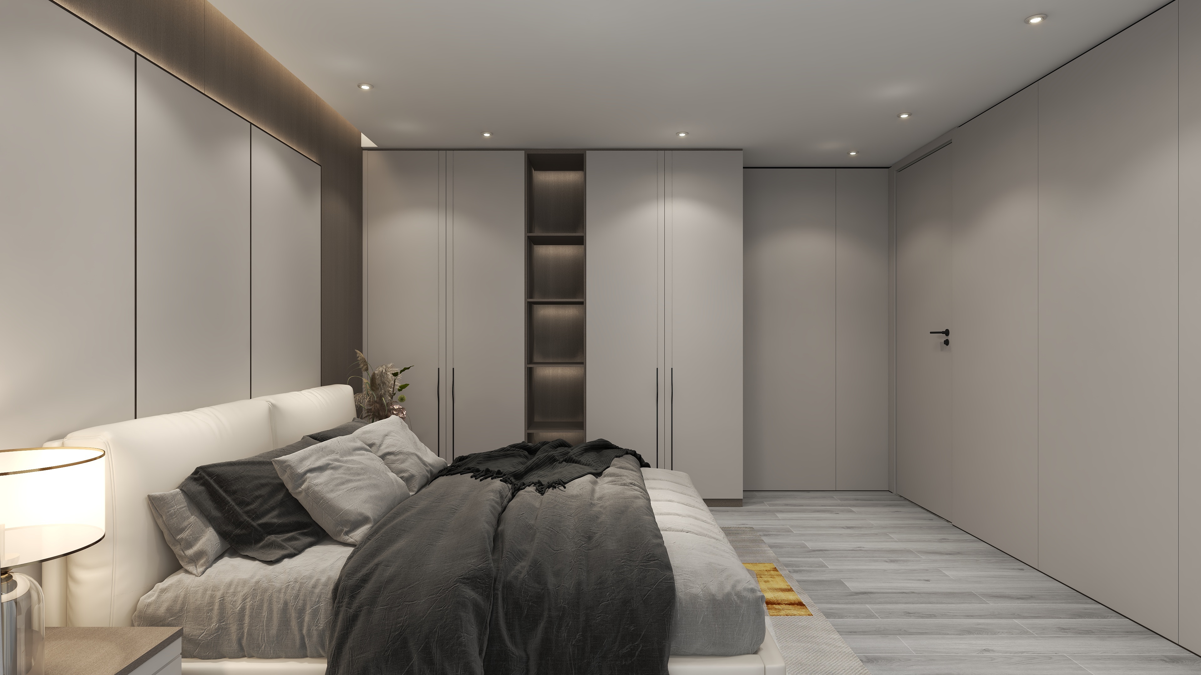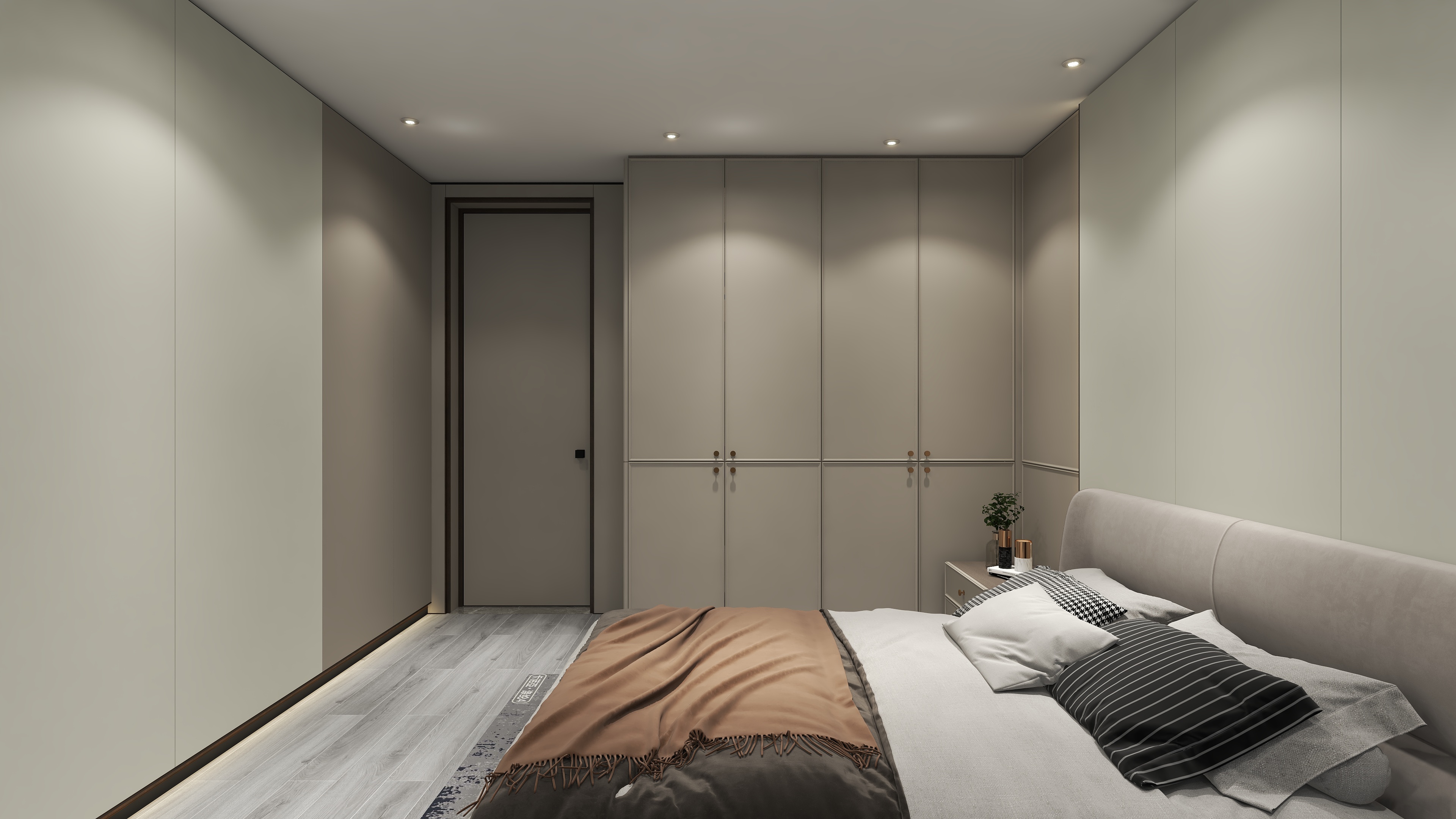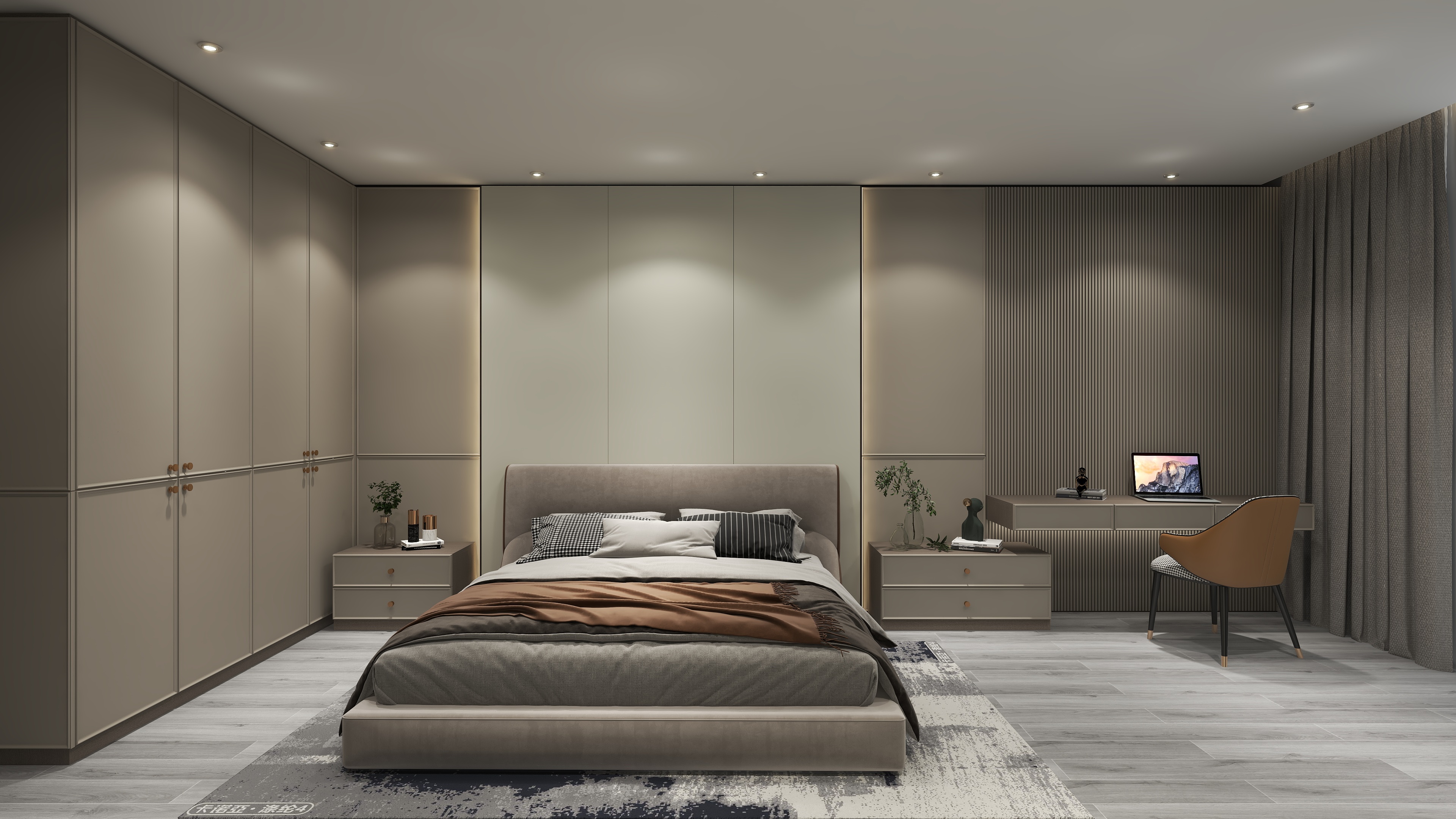 米蘭之吻系列,采用一體式柜體布局,整體動(dòng)線順暢開(kāi)闊。在以舒適為原則的基礎(chǔ)上,臥房護(hù)墻板及衣柜的柜門(mén)采用“嬌月白”與“優(yōu)雅暖灰”構(gòu)筑靜謐的底色,柜體采用“流光漫步”花色搭配。衣柜PVC吸塑柜門(mén)拋棄繁復(fù)的歐式紋飾,采用簡(jiǎn)歐線型,運(yùn)用小邊框勾勒出線條靈動(dòng)之美,一改傳統(tǒng)柜門(mén)一平到底的單調(diào)印象。“優(yōu)雅暖灰”花色打造的格柵立體造型護(hù)墻板,自帶高顏值的視覺(jué)享受。床頭背景墻隱藏式燈帶漫射暖光,溫馨之外更顯視覺(jué)層次感。