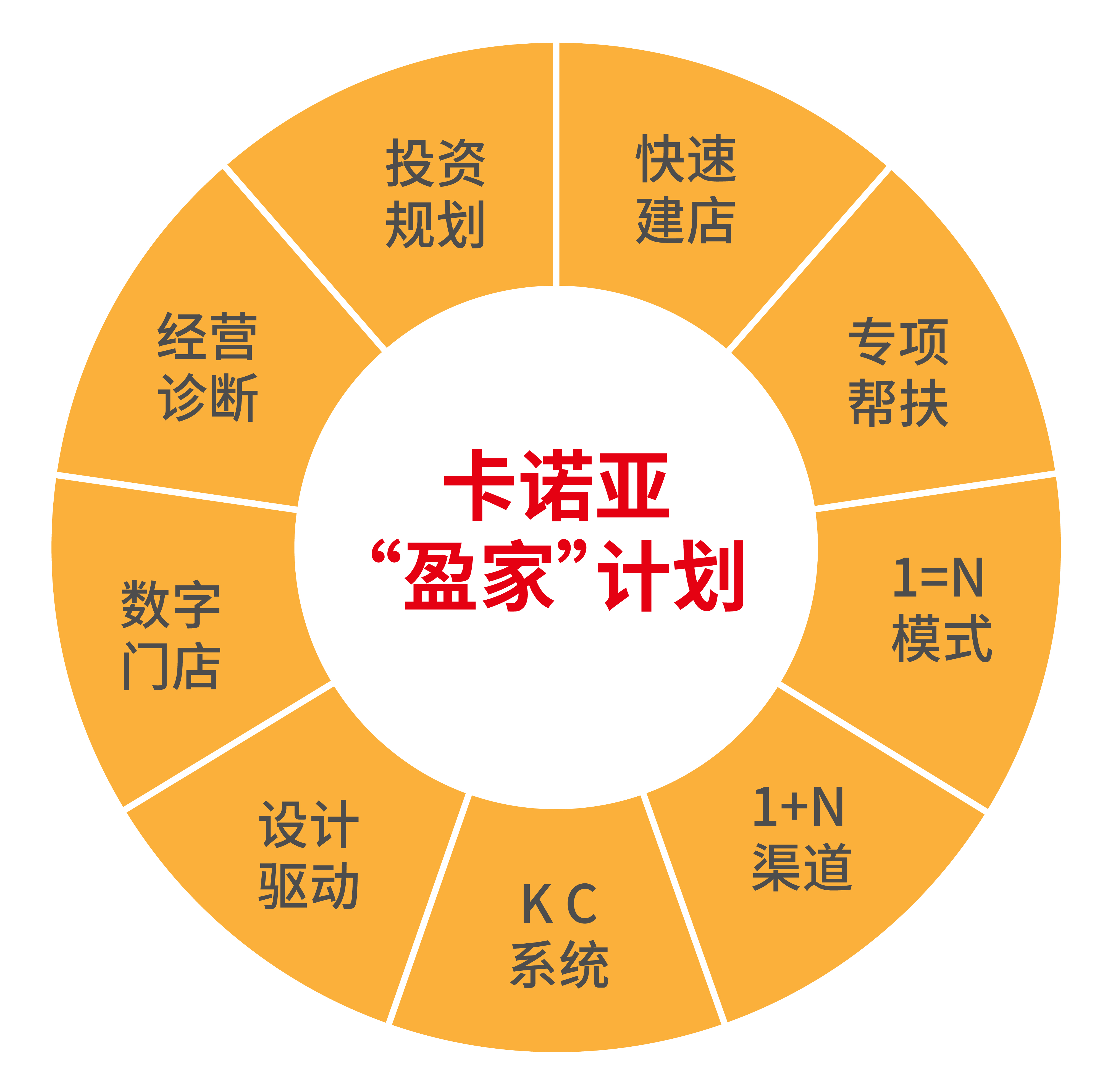 為了在全國范圍內(nèi)布局更大的市場,卡諾亞提供“盈家”計劃幫扶體系,全面賦能經(jīng)銷商,推出投資規(guī)劃、快速建店、專項幫扶、1=N模式、1+N渠道、KC系統(tǒng)、設計驅(qū)動、數(shù)字門店、經(jīng)營診斷等支持政策,從選址、裝修補貼到開業(yè)、運營管理,從全崗位培訓到營銷活動策劃支持,卡諾亞提供一系列規(guī)范化的幫扶體系,貫穿經(jīng)銷商的整個成長過程,幫其快速掌握定制家居專賣店運營知識,實現(xiàn)快速上手、快速開店。
