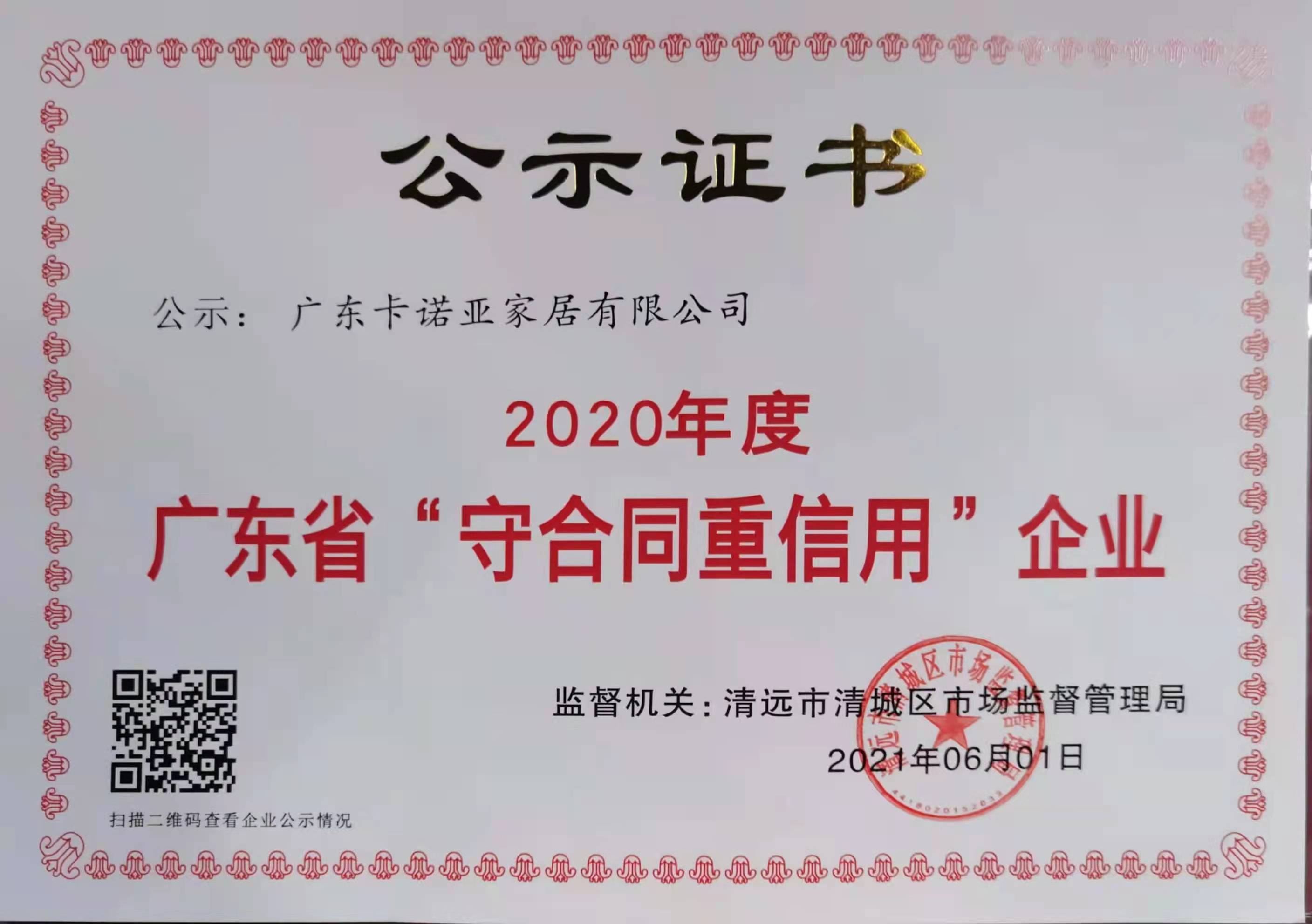 近日,廣東省清遠(yuǎn)市清城區(qū)市場監(jiān)督管理局對廣東省守合同重信用企業(yè)進(jìn)行公示,卡諾亞專注定制家居20年,一直以來憑借企業(yè)自身完善的合同管理機(jī)制及良好的合同履約狀況等企業(yè)誠信信用體系,連續(xù)兩年榮獲廣東省“守合同重信用”企業(yè)稱號,這是對卡諾亞誠信守約的經(jīng)營管理、優(yōu)良的信用文化建設(shè)與良好的客戶口碑的肯定。