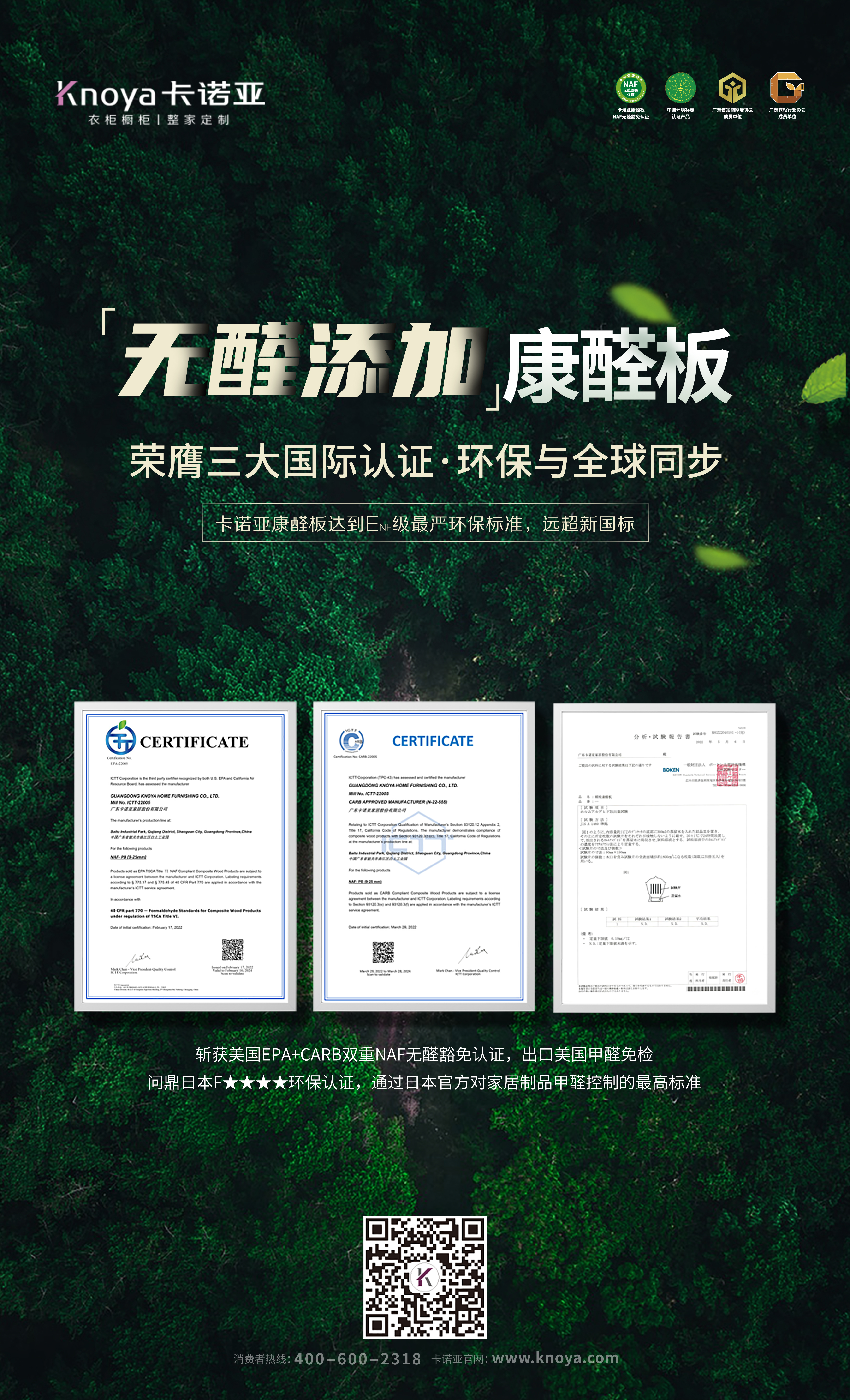 近年來,全球消費者環(huán)保意識逐漸增強,“綠色、健康、環(huán)保”在家居行業(yè)尤其受到消費者的關(guān)注。以“提供家居整體家居方案,創(chuàng)新引領(lǐng)人類健康生活”作為企業(yè)使命的卡諾亞,近期先后斬獲美國環(huán)境保護署EPA-NAF及加州空氣資源委員會CARB-NAF、日本F★★★★三大國際環(huán)保認證,成為業(yè)內(nèi)為數(shù)不多獲得以上3大國際認可的品牌,進一步夯實了卡諾亞整家定制“環(huán)保與世界同步”的核心優(yōu)勢。
