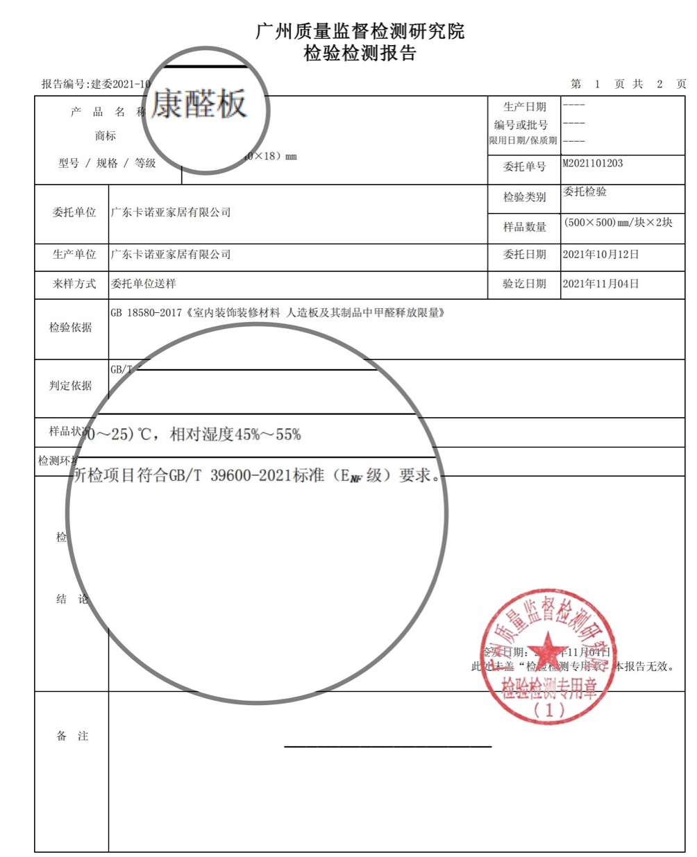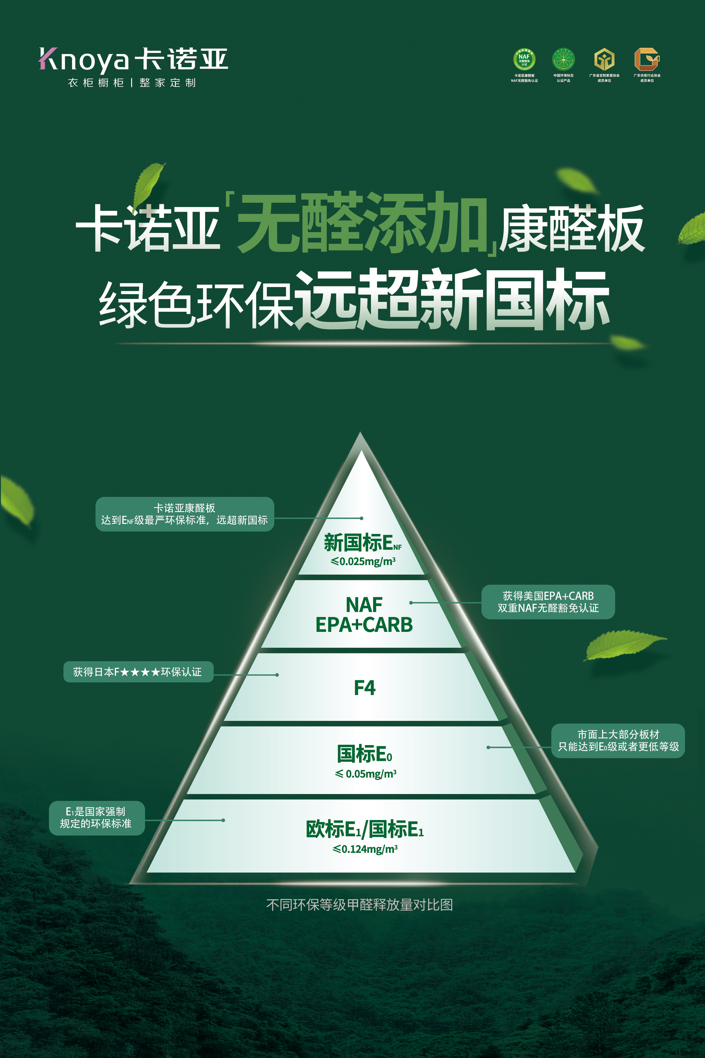 2021年10月1日實施新國標,將企業(yè)室內(nèi)用人造板及其制品的甲醛釋放量分為三個標準,E1級甲醛釋放量為≤0.124mg/m³,E0級為≤0.050mg/m³,最嚴苛的ENF級為≤0.025mg/m³,國家對人造板環(huán)保品質(zhì)提出了更高要求??ㄖZ亞推出的康醛板,經(jīng)權(quán)威部門檢測,甲醛釋放量≤0.025mg/m³,達到了全球最嚴格的ENF級環(huán)保標準。