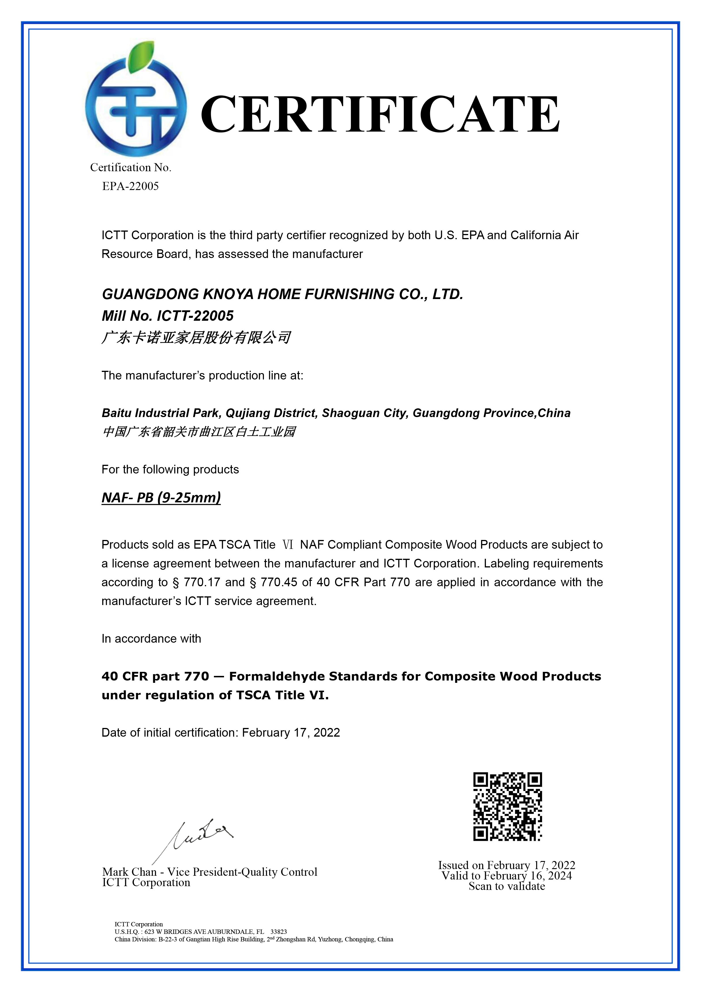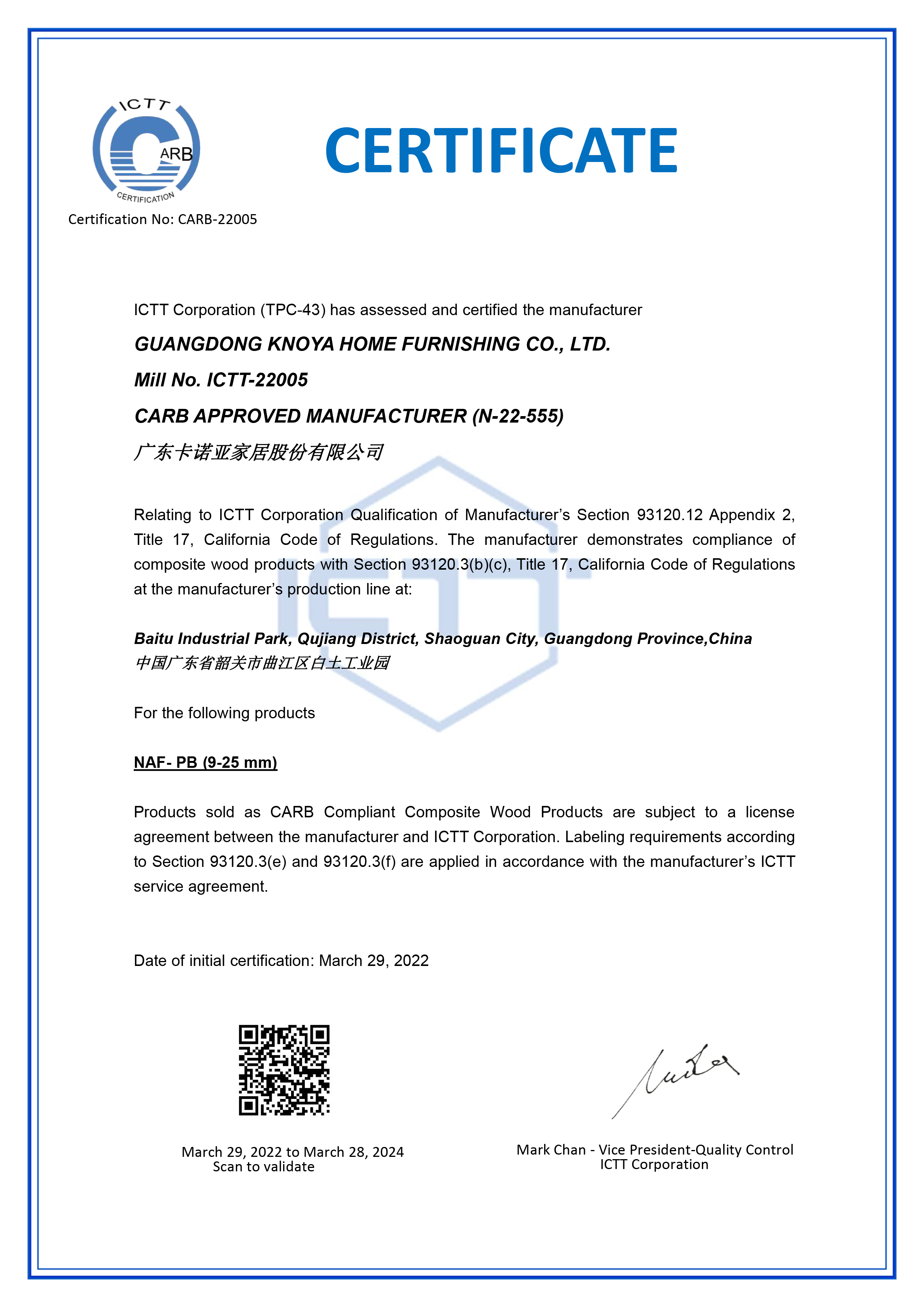 據(jù)悉,卡諾亞康醛板順利通過檢測,獲得美國環(huán)保署(EPA)及加州空氣資源委員會(CARB)兩大機構(gòu)頒發(fā)的NAF無醛豁免認證。斬獲兩大認證,意味著康醛板甲醛釋放量符合美國有毒物質(zhì)控制法的最高要求,即無醛豁免,對康醛板甲醛釋放量的項目免檢,讓康醛板在全美地區(qū)暢通無阻。獲得NAF認證并非易事,它要求板材在生產(chǎn)過程中,不使用、不添加任何含有甲醛成分的膠水、助劑等,這使得NAF成為目前全球板材甲醛釋放量要求至高的認證之一。
