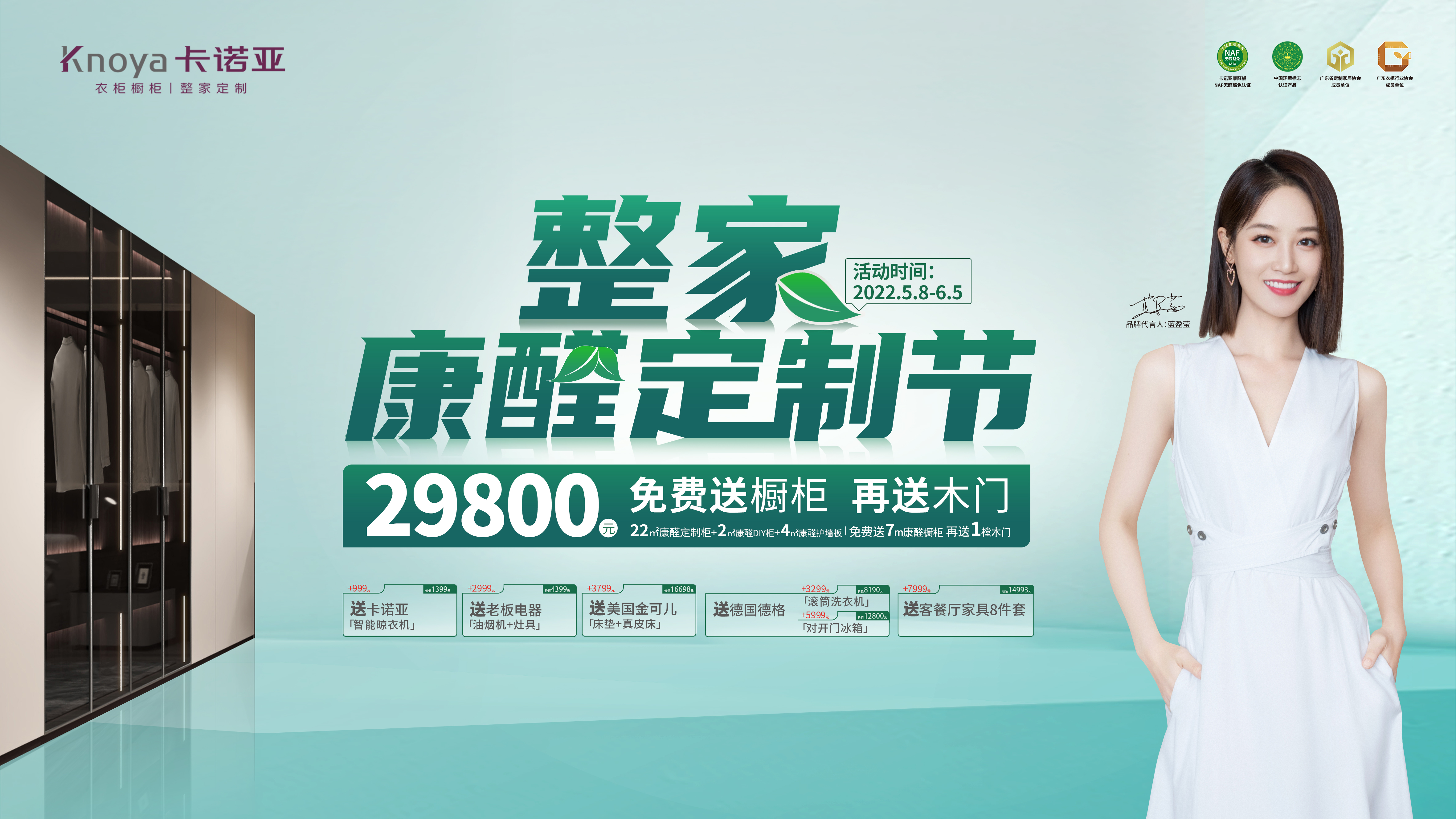 2022年5月8日-6月5日,卡諾亞在全國實力開展“整家康醛定制節(jié)”大型營銷活動,重磅推出新一輪環(huán)保硬核升級政策,整家康醛套餐¥29800包括22㎡康醛定制柜+2㎡康醛DIY柜+4㎡康醛護墻板,同時還免費送7m康醛櫥柜再送1樘木門,更有勁爆新品嘗鮮價、國際大牌家具家品、家電惠送等海量加碼福利,助力消費者輕松享受綠色家居。
